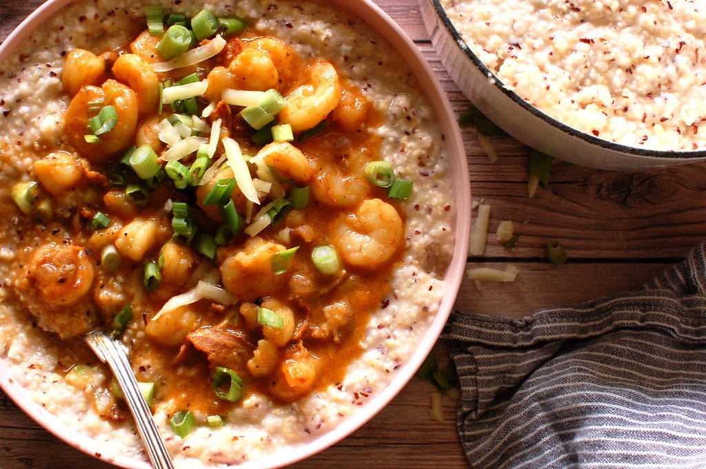 Fluffy, cheesy grits topped with saucy shrimp and bacon, straight from the South Carolina Lowcountry. What else do you need? This is a perfect, satisfying dinner—or top with an egg for an amazing breakfast or brunch dish.